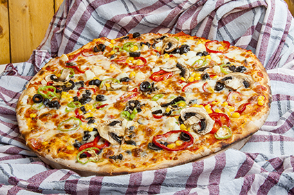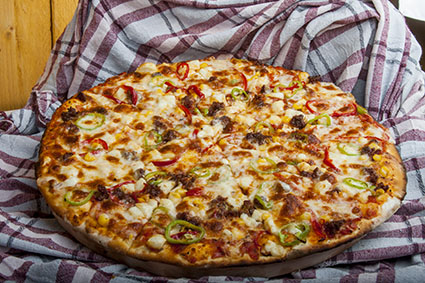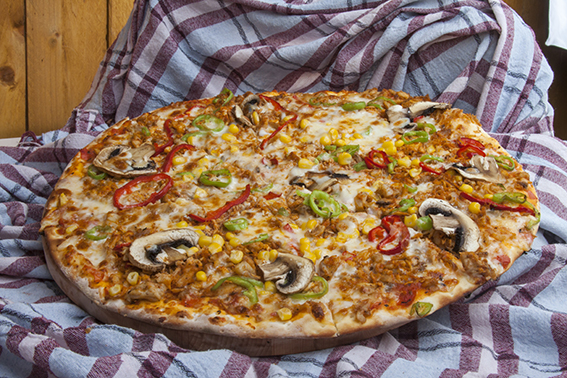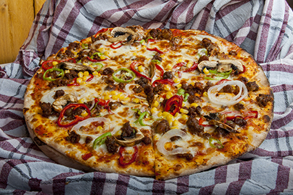 Pizza Sosu • Mozarella Peyniri• Taze Kaşar Peyniri • Fesleğen Kekikli Sarımsak Soslu Dana Eti • Yeşil-Kırmızı Biber • İnce Doğranmış Soğan • Mısır • Mantar