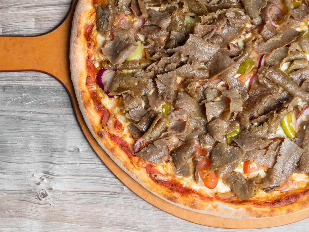 Pizza Sosu • Mozarella Peyniri• Taze Kaşar Peyniri • Fesleğen Kekikli Sarımsak Soslu Dana Eti • Yeşil-Kırmızı Biber • İnce Doğranmış Soğan • Mısır • Mantar